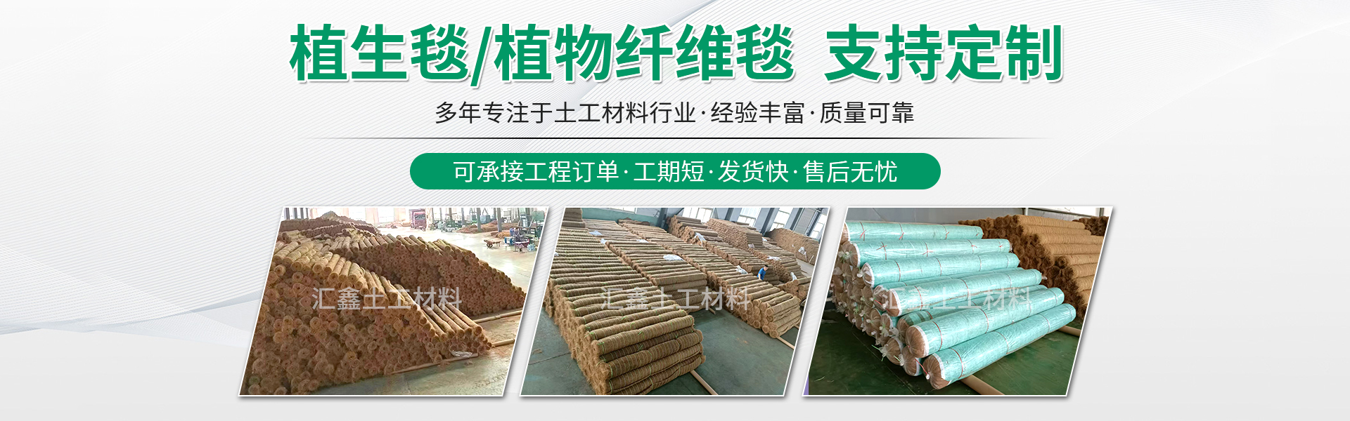 汇鑫土工材料是专业的护坡绿化材料和土工合成材料的生产厂家。是产品的研发、生产、销售、售后服务及设计施工为一体的综合性企业。公司主要生产销售植物纤维毯、植生毯、椰丝毯、抗冲生物毯、生态毯、秸秆纤维毯、麻椰固土毯、塑筋水保抗冲椰垫、水土保护毯、洛克沃毯、生态袋、植生袋等各种护坡材料,及各种土工材料提供一站式服务,实力大厂,现货速发,特殊产品均可定制生产。汇鑫产品广泛应用于重点工程领域,如公路、铁路、地铁、高速公路绿化护坡、垃圾填埋场、山体复绿、工业防渗、建筑业、矿山修复、农业、生态绿化系统等工程领域。经广大工程单位使用证明,产品质优价廉,施工方便,售后服务好,得到广大客户的一致好评。"为客户提供优质产品及服务"的宗旨, 热诚希望携手各界朋友,共铸…详情介绍>>